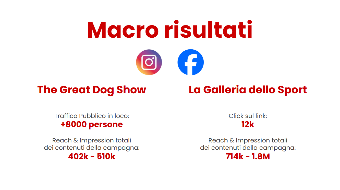 I due progetti più impegnativi in termini di budget e risultati raggiunti sono stati The Great Dog Show e La Galleria dello Sport. Il primo è l'evento cinofilo più significativo della città, rivolto agli amanti degli animali e alle famiglie. Il secondo è una grande manifestazione multidisciplinare che trasforma il centro commerciale in un vivace villaggio sportivo all’aperto.